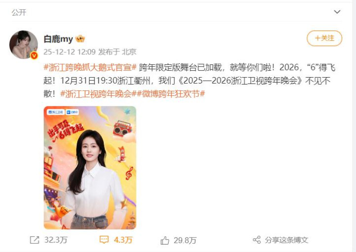 2025年12月12日,浙江卫视正式官宣了2026跨年晚会的嘉宾阵容。