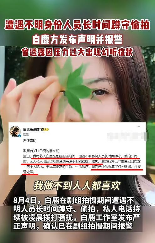 她在剧组拍摄期间,不仅遭到不明身份人员长时间蹲守、偷拍。