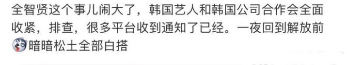 有网友爆料,全智贤这个事儿已经闹大了,韩国艺人和韩国公司合作会全面收紧,排查,很多平台已经收到通知,之前的努力全部白搭。