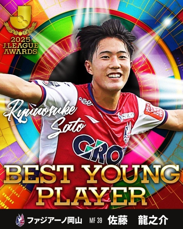 另外,冈山绿雉球员佐藤龙之介获得年度最佳年轻球员,这位19岁中场本赛季出战28场J1联赛,贡献6球2助攻,德转身价55万欧。J联赛颁奖典礼将于12月11日进行。