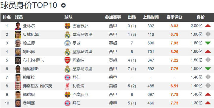 足坛现役十大最贵球员,其中巴萨边锋亚马尔以2亿欧元领跑,皇马进攻型中场贝林厄姆和曼城锋霸哈兰德以1.8亿欧元并列第二,但大部分球迷认为贝林厄姆身价虚高,前十榜单皇马、巴萨、拜仁均2人上榜!