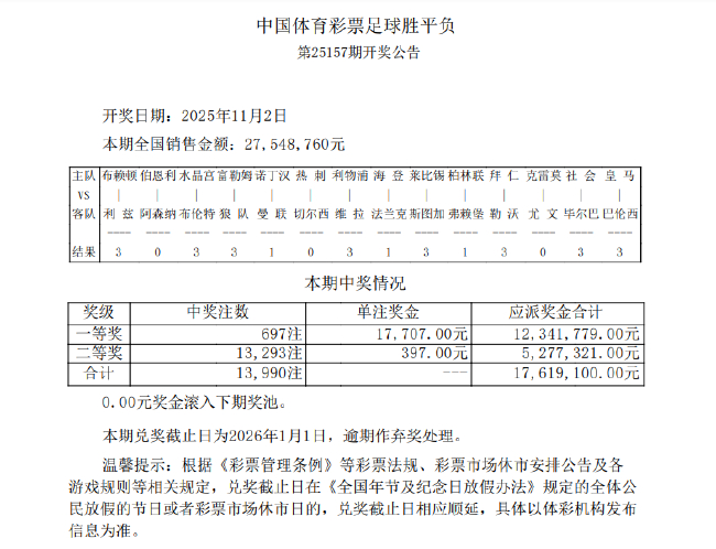 北京时间11月2日,胜负彩第25157期开奖结果揭晓。本期一等奖开出697注,单注奖金17,707元。二等奖共13,293注,单注奖金397元;任九开出66,415注222元。本期胜负彩销量为27,548,760元,任九投注总额为23,074,944元。